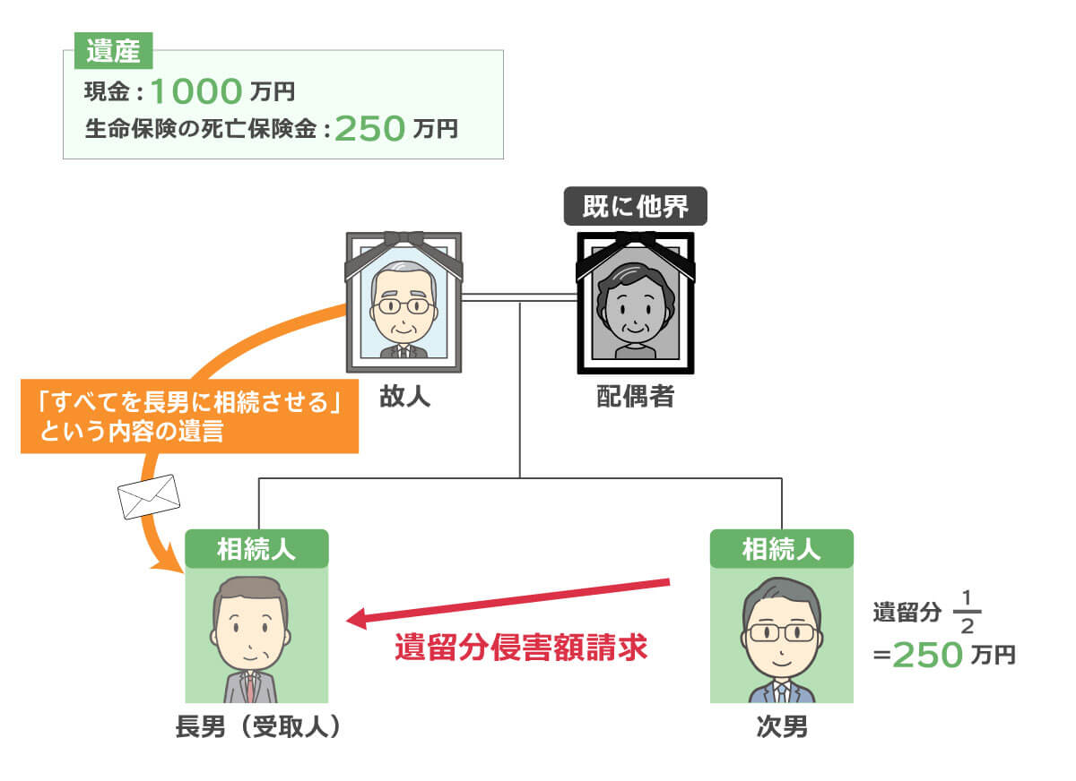 この場合、次男は遺産総額1000万円×1/2(法定相続分)×1/2(遺留分)=250万円を遺留分侵害額として長男に請求することができますが、長男は生命保険金から遺留分侵害額の支払いをすることができます。