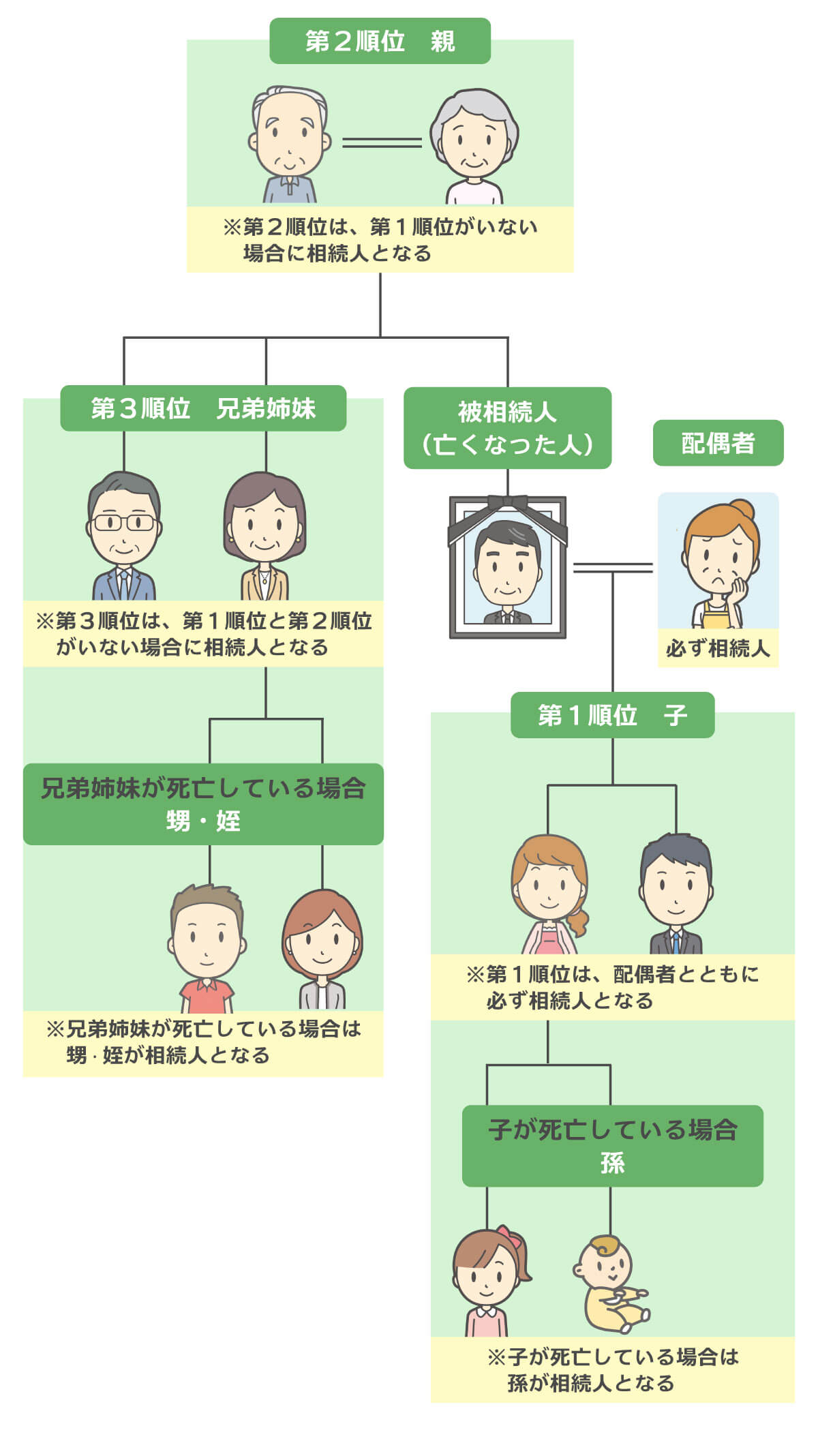 配偶者は常に相続人になる一方、子・父母・兄弟姉妹など法定相続人は順位制になっています。上位の順位の人がいる場合、下位の順位の人は相続人になれません。