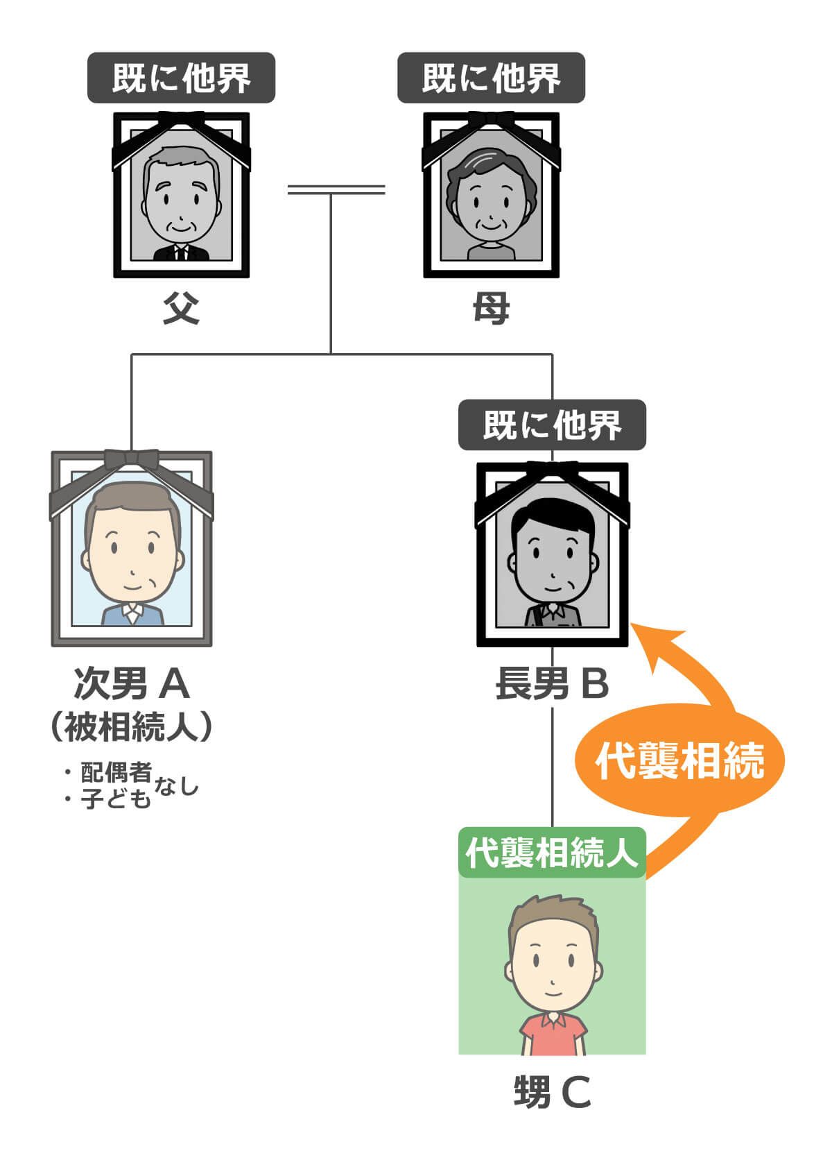 具体的な例で説明すると、被相続人Aに配偶者も子も父母もおらず、兄Bがいたとします。しかし、BはAより先に亡くなっており、Bには子のC(Aの甥)がいる場合、CがBに代わって相続人となることができます。
