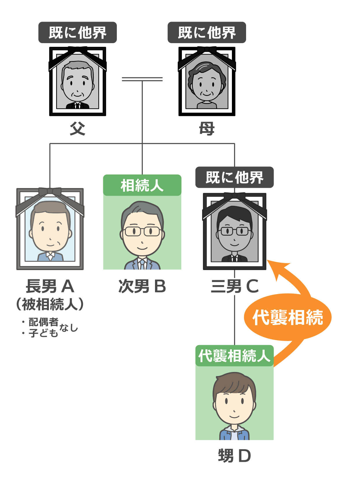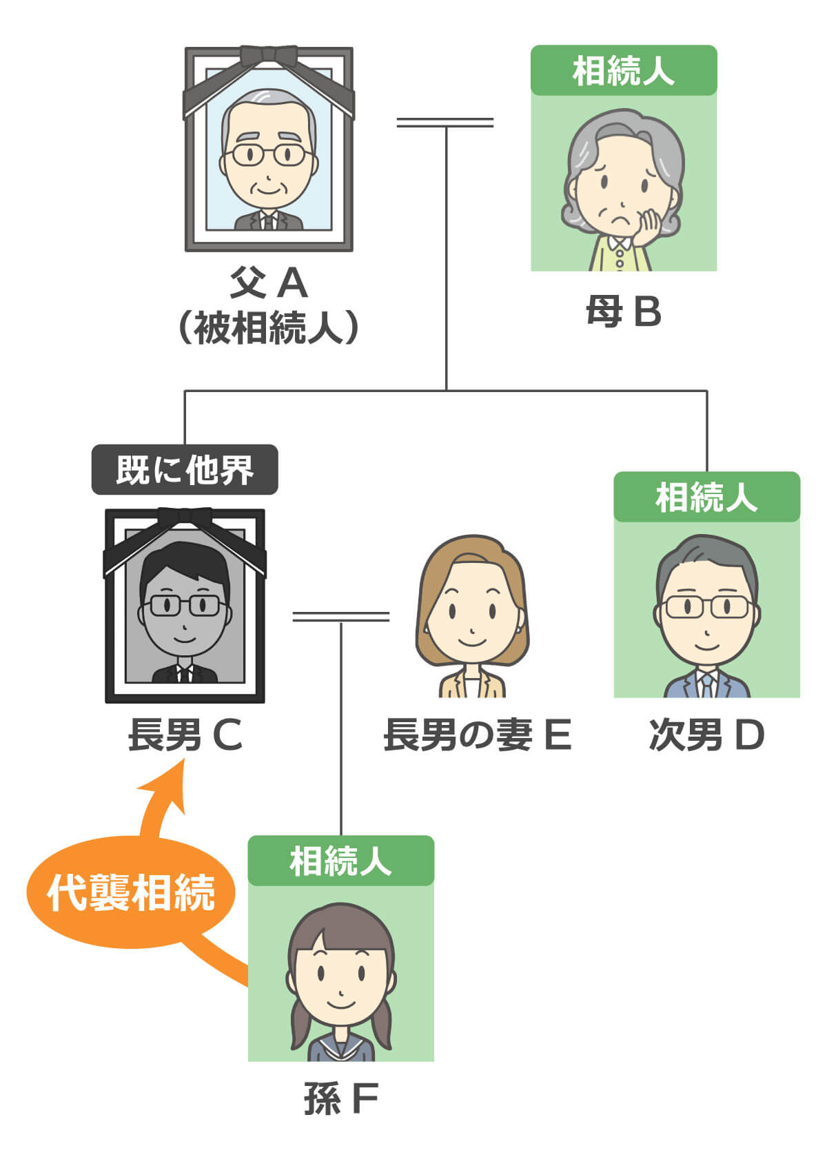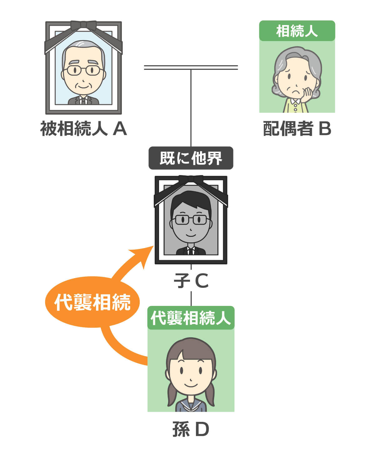 たとえば、Aさんが亡くなり、Aさんには配偶者Bさんと子のCさんがいたとします。しかし、CさんはAさんより先に亡くなっており、Cさんには子のDさん(Aさんの孫)がいる場合、DさんがCさんに代わって相続人となるのです。