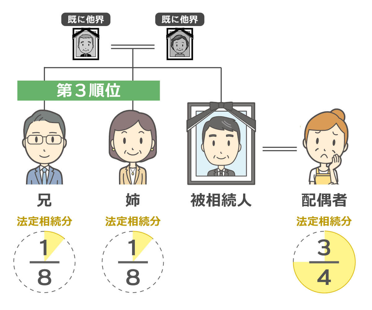 兄弟姉妹が配偶者と同時に相続人となる場合、配偶者が4分の3、兄弟姉妹が4分の1を相続します。