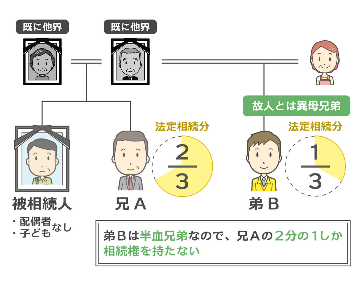 たとえば、全血兄弟1人と半血兄弟1人が相続人の場合、全血兄弟が3分の2、半血兄弟が3分の1を相続することになります。