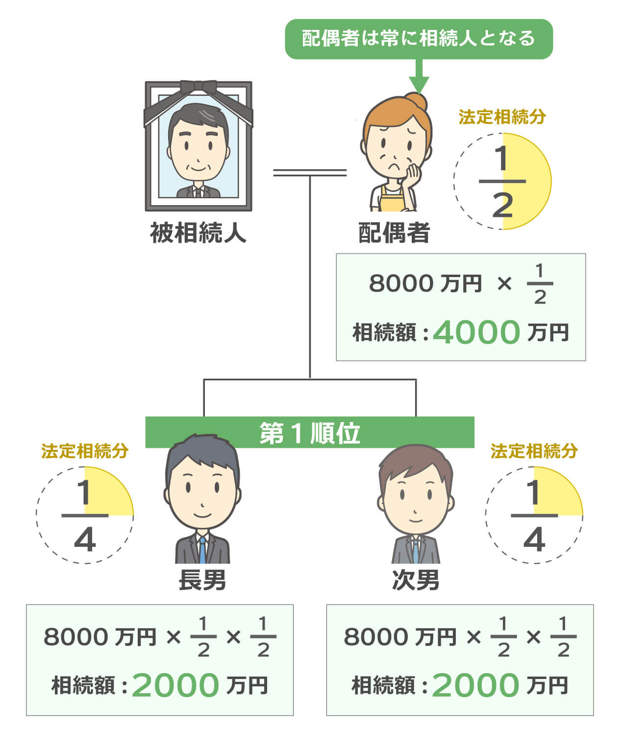 このように、配偶者(妻)が遺産の半分である4000万円を相続し、残りの4000万円を子どもたちが人数で均等に分けるため、長男と次男がそれぞれ2000万円ずつ相続することになります。