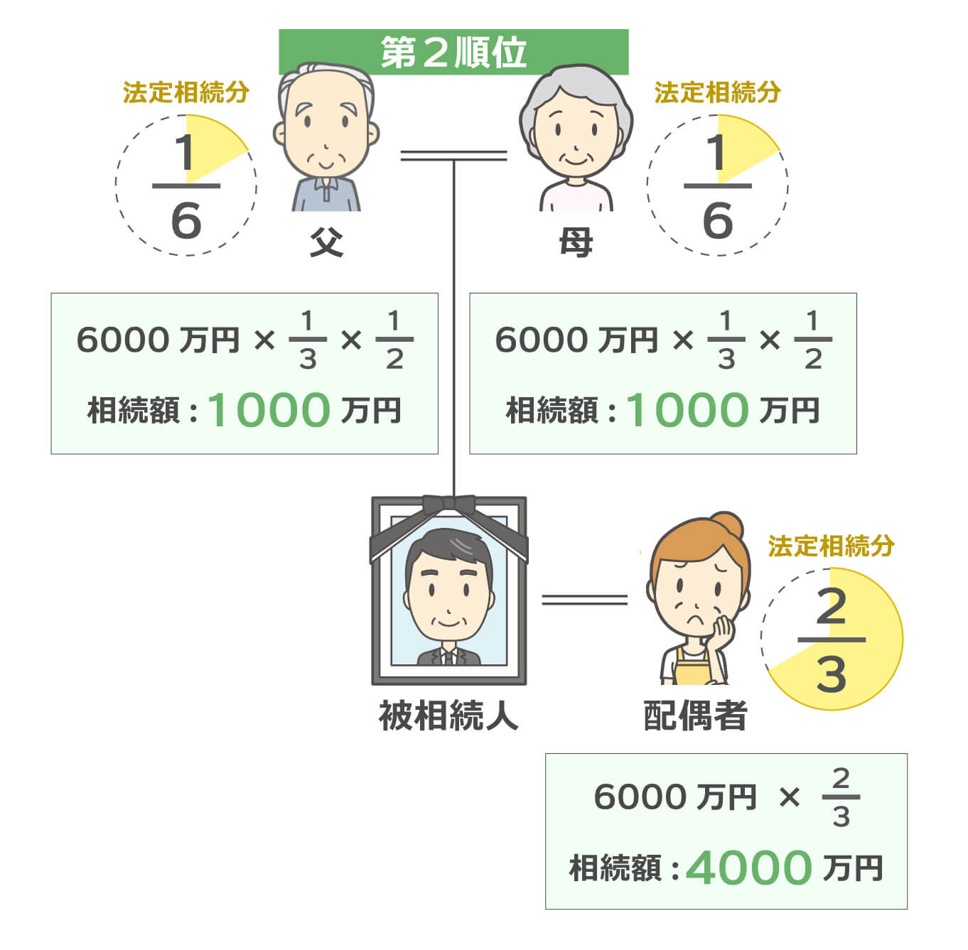 もし父母のどちらかがすでに亡くなっている場合は、生きている方の親が直系尊属の相続分である3分の1をすべて相続します。たとえば母だけが生きている場合、妻が4000万円、母が2000万円を相続することになります。