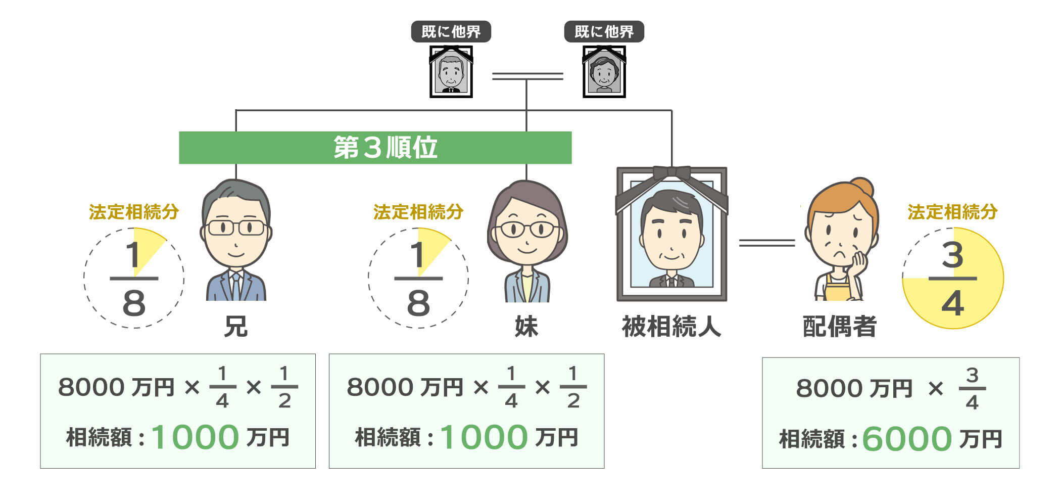 妻が遺産の4分の3である6000万円を相続し、残りの4分の1である2000万円を兄妹2人で均等に分けるため、それぞれ1000万円ずつ相続することになります。