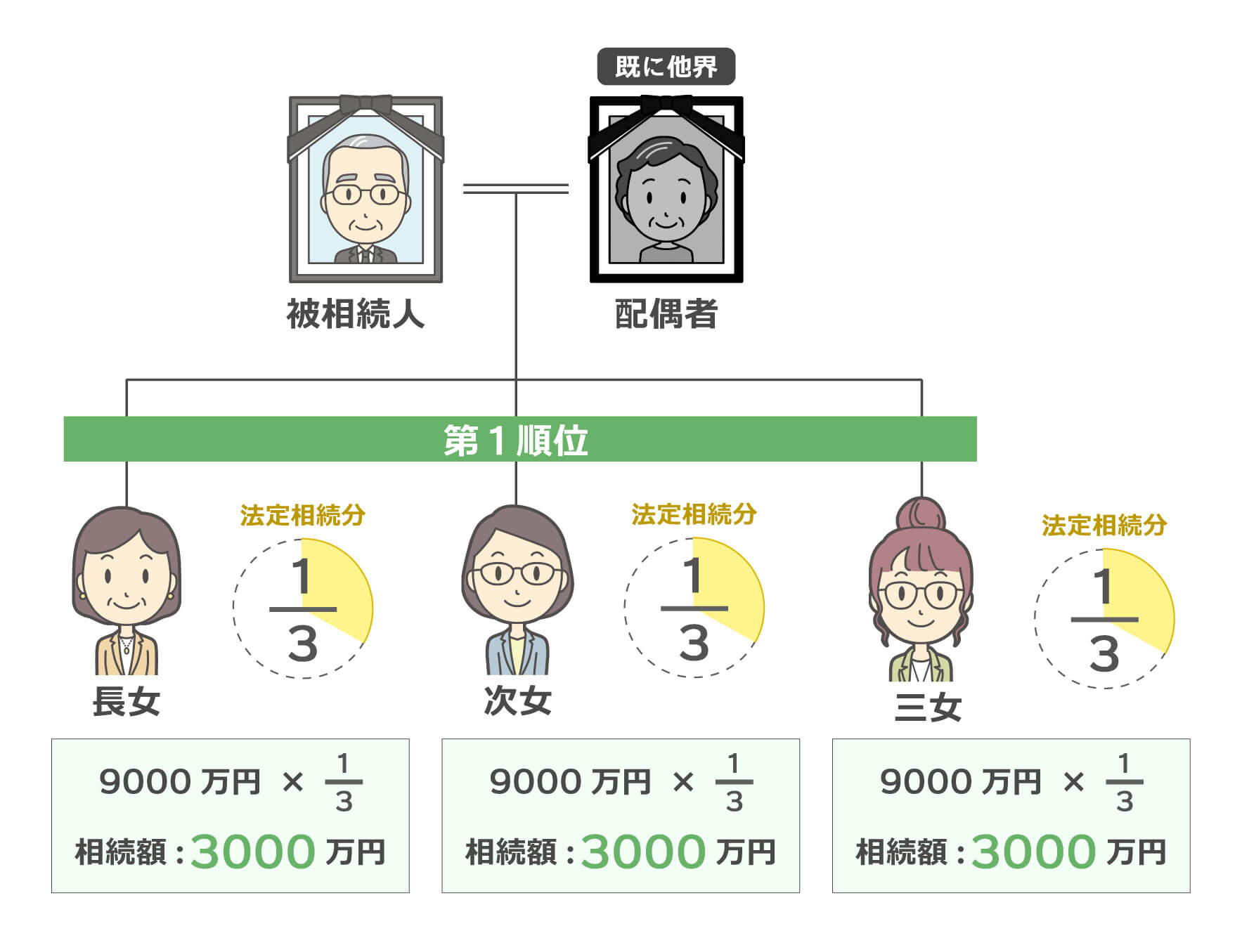 このように、子どもだけが相続人の場合は、遺産を子どもの人数で均等に分けます。3人の娘がそれぞれ3000万円ずつ相続することになります。