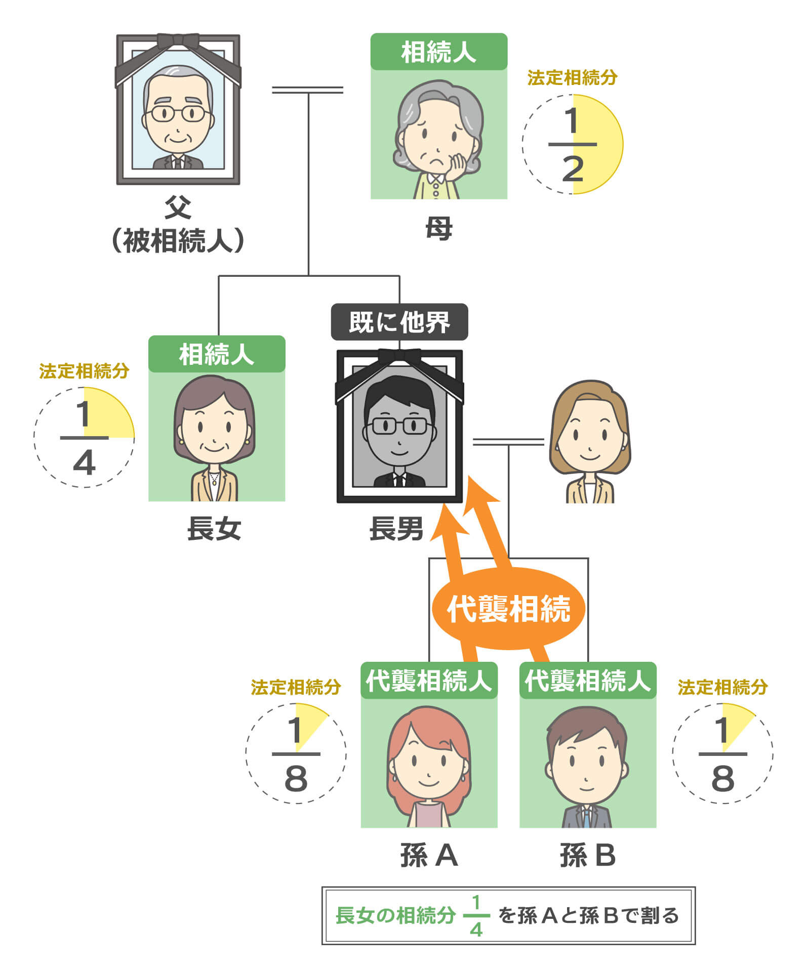 たとえば、故人に配偶者と子どもが2人(長男と長女)いたとします。このとき、長男が故人よりも先に亡くなっていて、長男には子どもが2人(孫A、孫B)いる場合を考えてみましょう。