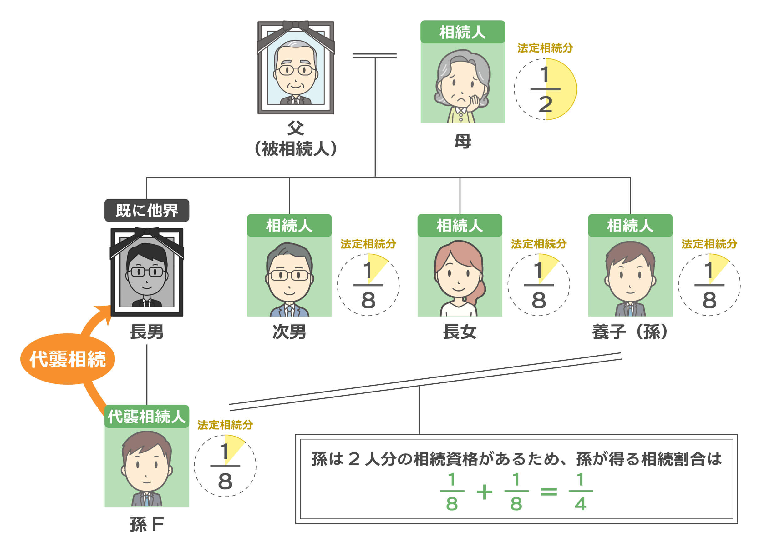 そして、養子がもともと故人の代襲相続人だったときは、養子と代襲相続人の2重の資格を持つことになり、両方の資格の相続分を足し合わせることになります。