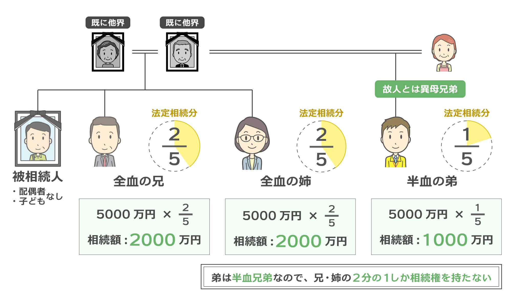 たとえば、故人に配偶者と子がおらず、父母もすでに亡くなっており、全血の兄1人、全血の姉1人、半血の弟1人がいて、遺産の総額が5000万円のケースを考えてみましょう。この兄弟姉妹が相続人となりますが、相続額は以下のようになります。